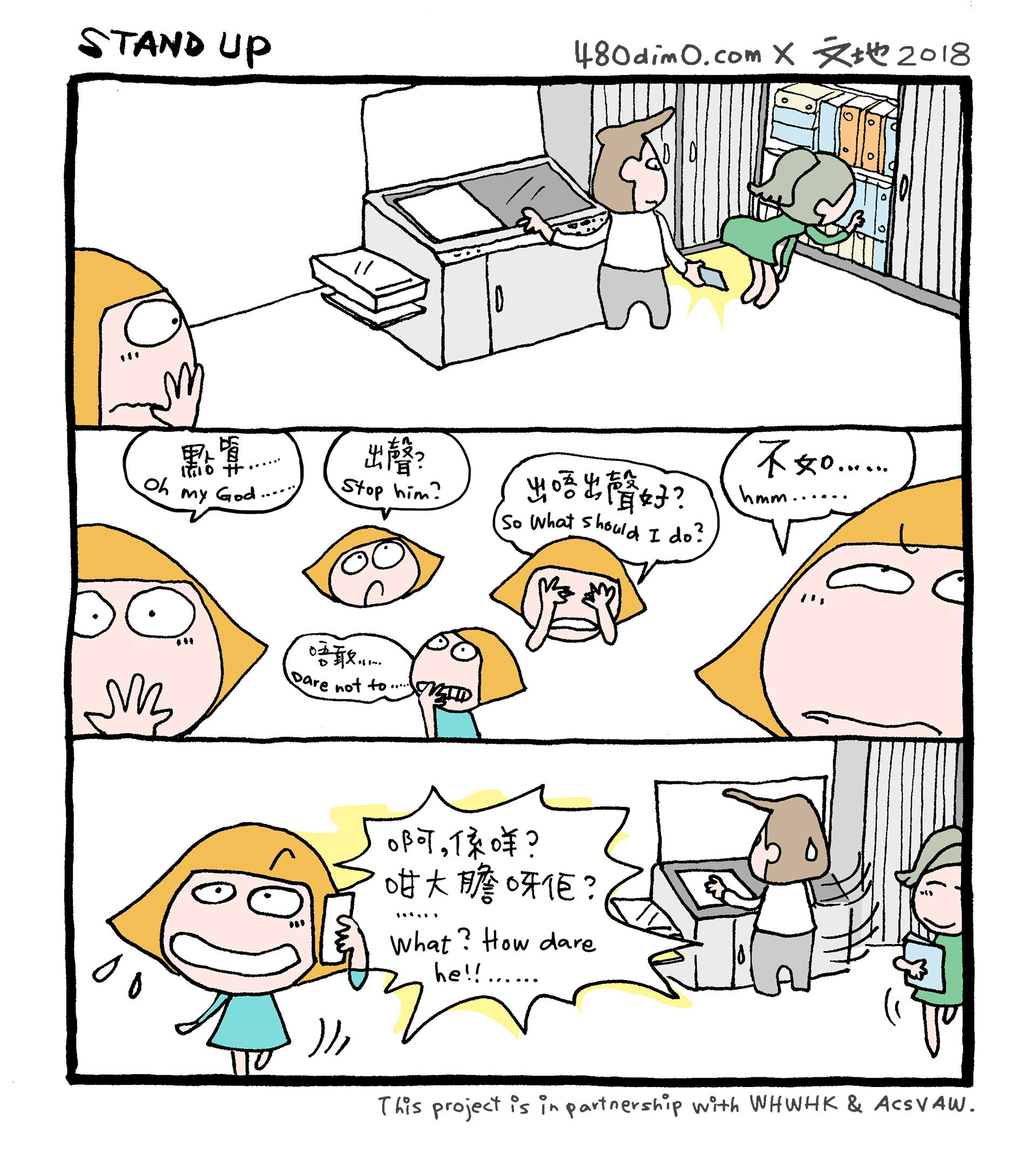 Honoring the International Women’s Day and with the support of Women Helping Women Hong Kong (WHWHK), we are launching the “Anti-sexual harassment information kit”. We have invited Mandycat to design the STAND UP Memo as part of the info for the campaign to raise awareness of workplace sexual harassment and to encourage everyone stands up for victims of sexual harassment. What would you do when you encounter such sexual harassment situation?