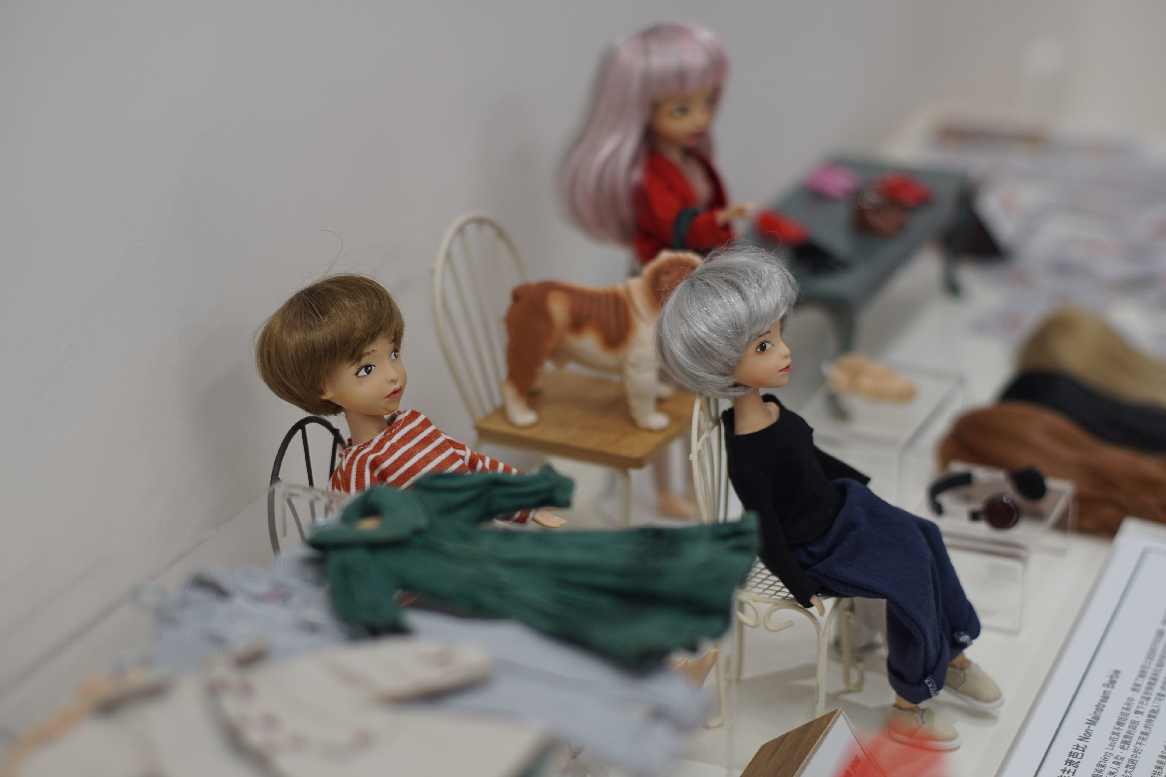 娃娃藝術家Ning Lau特別為這『性別Toy教』展覽創作了不同表情的娃娃,她們跟真人一樣:有瘦有肥、有雙下巴有尖面、有開心和變愁的時候:造型方面有裙子也有褲子、有皮鞋球鞋高跟鞋、娃娃也可以隨自己心情改變髮型及髮色... 你來幫她決定吧。
